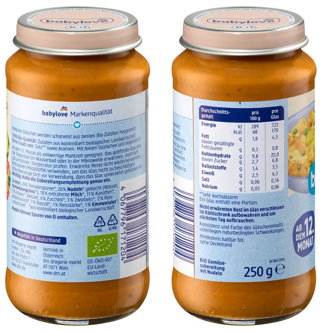 Skład: 29% przecier pomidorowy*, 20% makaron* (woda, semolina z pszenicy durum*) gotowany, 18% odtłuszczone mleko*, 11% marchew*, woda, 5% groszek* , 4% cukinia*, 3% cebula*, 2% pełnoziarnista mąka ryżowa*, 1% olej rzepakowy*, 1% skrobia ryżowa*, 1% ser ementaler*, lubczyk*. *z kontrolowanych upraw ekologicznych. Makaron może zawierać śladowe ilości jaj. Organ kontrolny ÖKO: DE-ÖKO-007