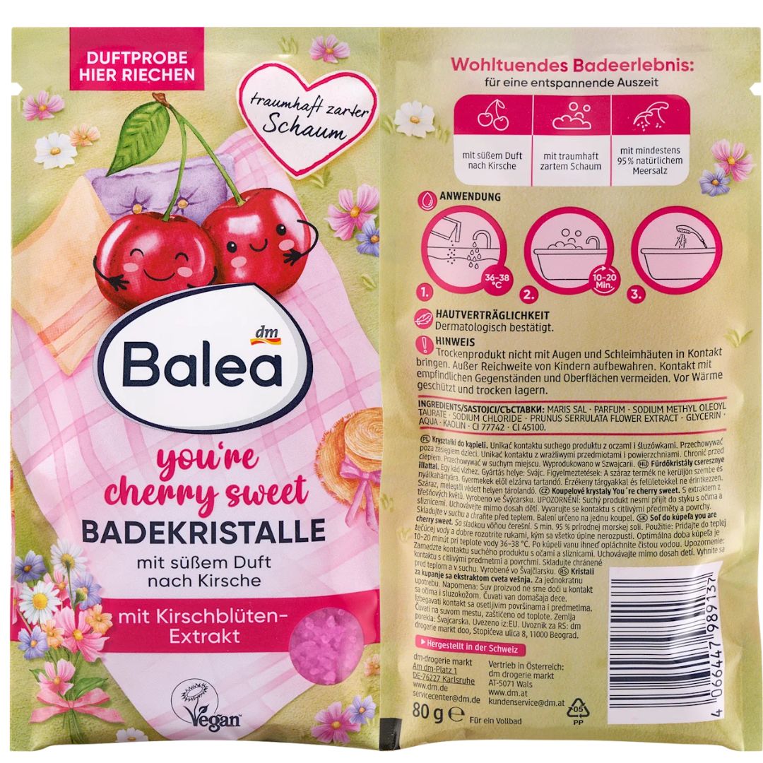 Kryształki do kąpieli Balea „You're Cherry Sweet” z ekstraktem z kwiatu wiśni i słodkim aromatem wiśni zapewniają aromatyczną kąpiel. Delikatna piana i owocowy aromat tworzą relaksującą atmosferę w łazience. Formuła została przetestowana dermatologicznie i idealnie nadaje się na chwilę relaksu i odprężenia. Chwila relaksu i rozpieszczenia dla ciała i zmysłów.