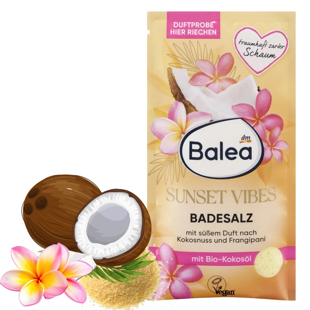 Sole do kąpieli Balea Sunset Vibes, o słodkim zapachu kokosa i plumerii, zapewniają kojące doznania kąpielowe i relaksującą ucieczkę od codzienności. Formuła, zawierająca co najmniej 95% naturalnej soli morskiej, tworzy cudownie miękką pianę. Wzbogacona organicznym olejem kokosowym, pielęgnuje skórę, a słodki zapach oczarowuje zmysły. Produkt wegański, dermatologicznie potwierdzony.
